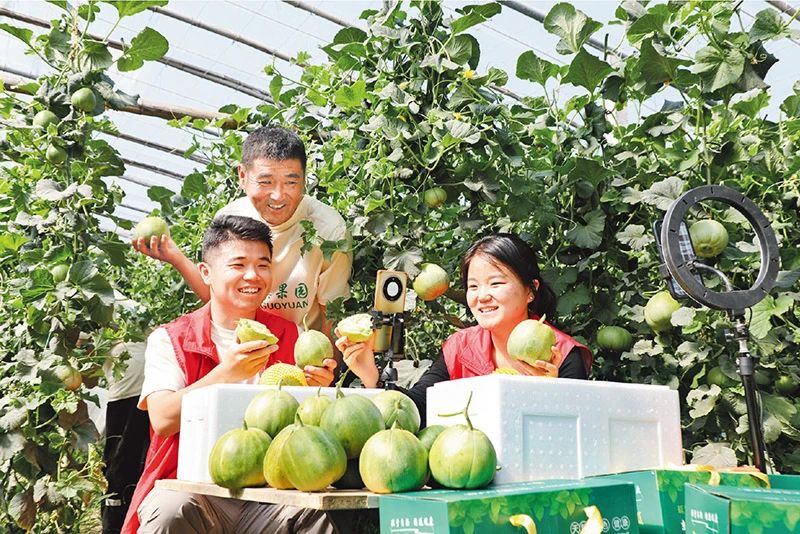 各地黨員、干部大力發(fā)揚(yáng)密切聯(lián)系群眾的作風(fēng),立足崗位擔(dān)當(dāng)作為、服務(wù)群眾。圖為2025年5月11日,河南省新鄉(xiāng)市延津縣南秦莊村甜瓜種植大棚內(nèi),黨員志愿者通過(guò)現(xiàn)場(chǎng)直播,幫助農(nóng)戶(hù)推銷(xiāo)甜瓜。 人民圖片 張燕/攝