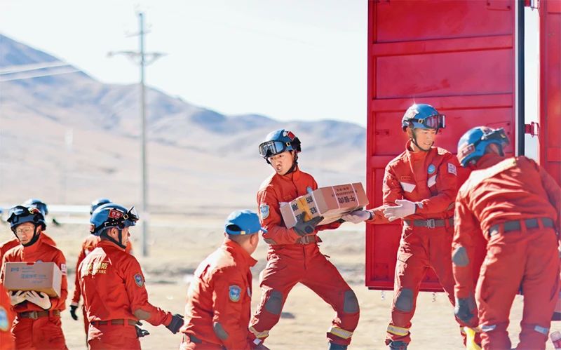 新時代以來,廣大青年在搶險救災(zāi)前線沖鋒陷陣,在黨和人民最需要的時刻沖得出來、頂?shù)蒙先?,展現(xiàn)出自信自強、剛健有為的精神風(fēng)貌。2025年1月7日,西藏自治區(qū)日喀則市定日縣發(fā)生6.8級地震。圖為1月9日西藏自治區(qū)森林消防總隊派出的救援人員在地震重災(zāi)區(qū)日喀則市拉孜縣拉孜鎮(zhèn)措布村卸載救災(zāi)物資。新華社記者 姜帆/攝