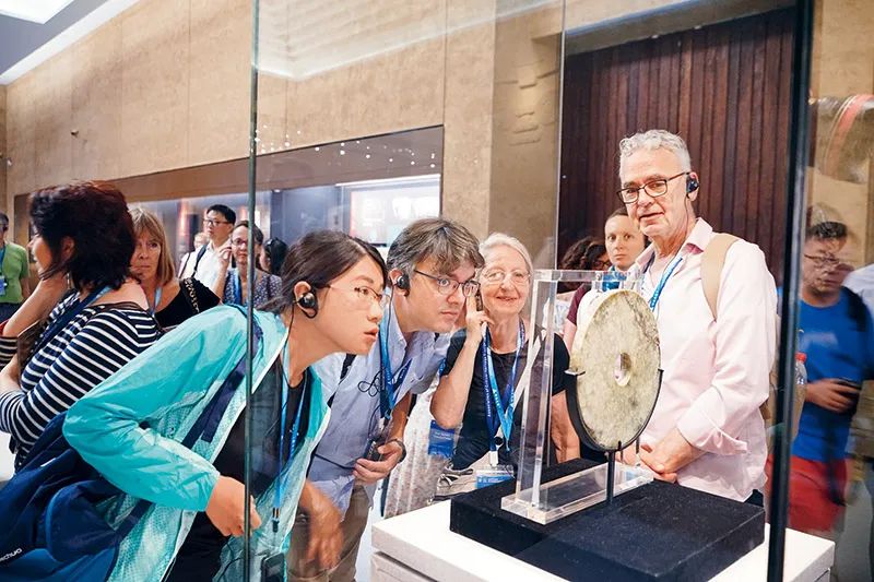 圖為第四屆文化遺產(chǎn)世界大會(huì)期間國際專家學(xué)者參觀良渚博物院?!×间静┪镌汗﹫D