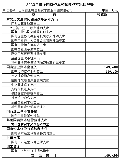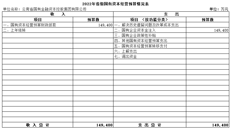 ?根據(jù)《云南省財(cái)政廳關(guān)于批復(fù)2022年省級(jí)國有資本經(jīng)營預(yù)算的通知》(云財(cái)資〔2022〕1號(hào))要求,現(xiàn)將我公司2022年國有資本經(jīng)營預(yù)算情況公示如下: