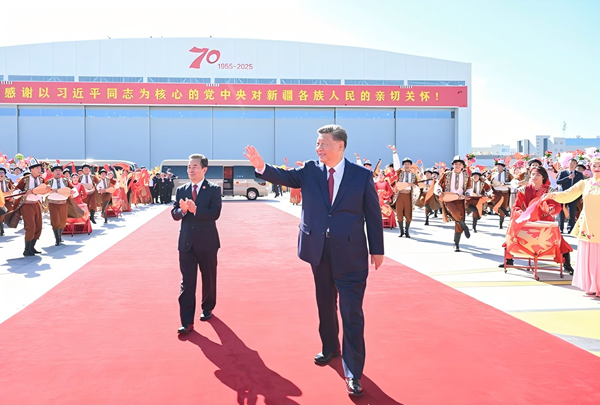 中共中央總書記、國家主席、中央軍委主席習(xí)近平在烏魯木齊出席新疆維吾爾自治區(qū)成立70周年慶?;顒雍螅?月25日中午乘專機返回北京。這是習(xí)近平在烏魯木齊天山國際機場向前來歡送的各族群眾揮手致意。新華社記者 謝環(huán)馳 攝