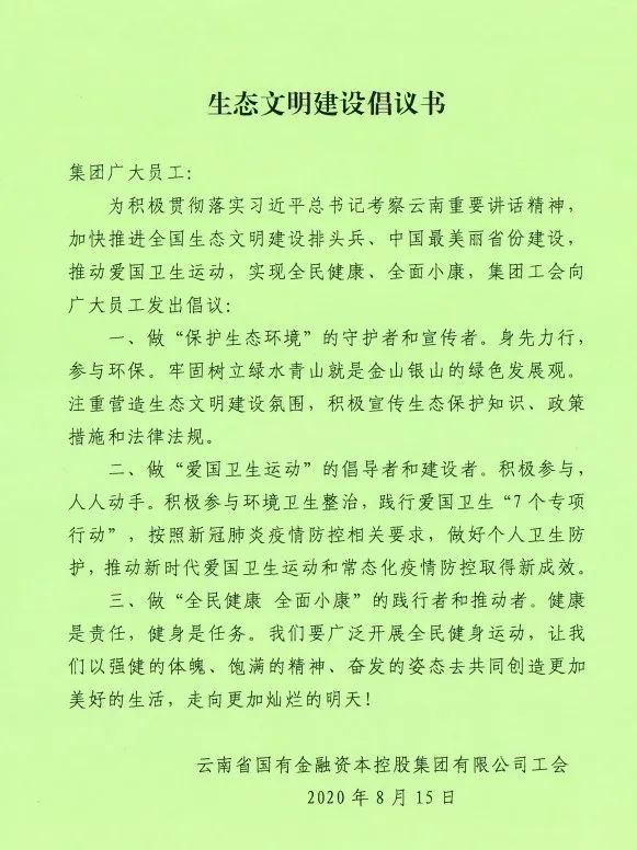 ?今后,集團工會將持續(xù)開展內(nèi)容豐富、形式多樣的文體活動,進一步鼓勵和引導廣大員工積極貫徹落實習近平總書記考察云南講話精神,推進生態(tài)文明建設,以強健的體魄和飽滿的精神切實履行好集團“服務實體經(jīng)濟、深化金融改革、防控金融風險”三大使命任務,加強國有金融資本集中統(tǒng)一管理、不斷優(yōu)化國有金融資本布局結(jié)構(gòu)的實際成效,推動集團高質(zhì)量穩(wěn)健發(fā)展,為全省決戰(zhàn)脫貧攻堅、決勝全面建成小康社會作出應有貢獻。