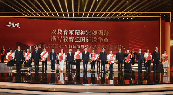 隨后,慶祝活動(dòng)在師生情景講述《先生頌》中拉開序幕,由師生自編自演的節(jié)目溫馨感人。情景分享《一天·一年·一輩子》、《薪火成炬》等深情歌頌廣大教師愛黨愛國、堅(jiān)守講臺(tái)、默默耕耘的精神風(fēng)貌,歌舞秀《背著書包來留學(xué)》、特殊教育情景劇《生命之光》等生動(dòng)展現(xiàn)我省教育事業(yè)改革發(fā)展新突破新成就,尾聲環(huán)節(jié)全體演職人員合唱《每當(dāng)我走過老師窗前》,熱烈的掌聲再次響起,向廣大教師致以深切的謝意。
