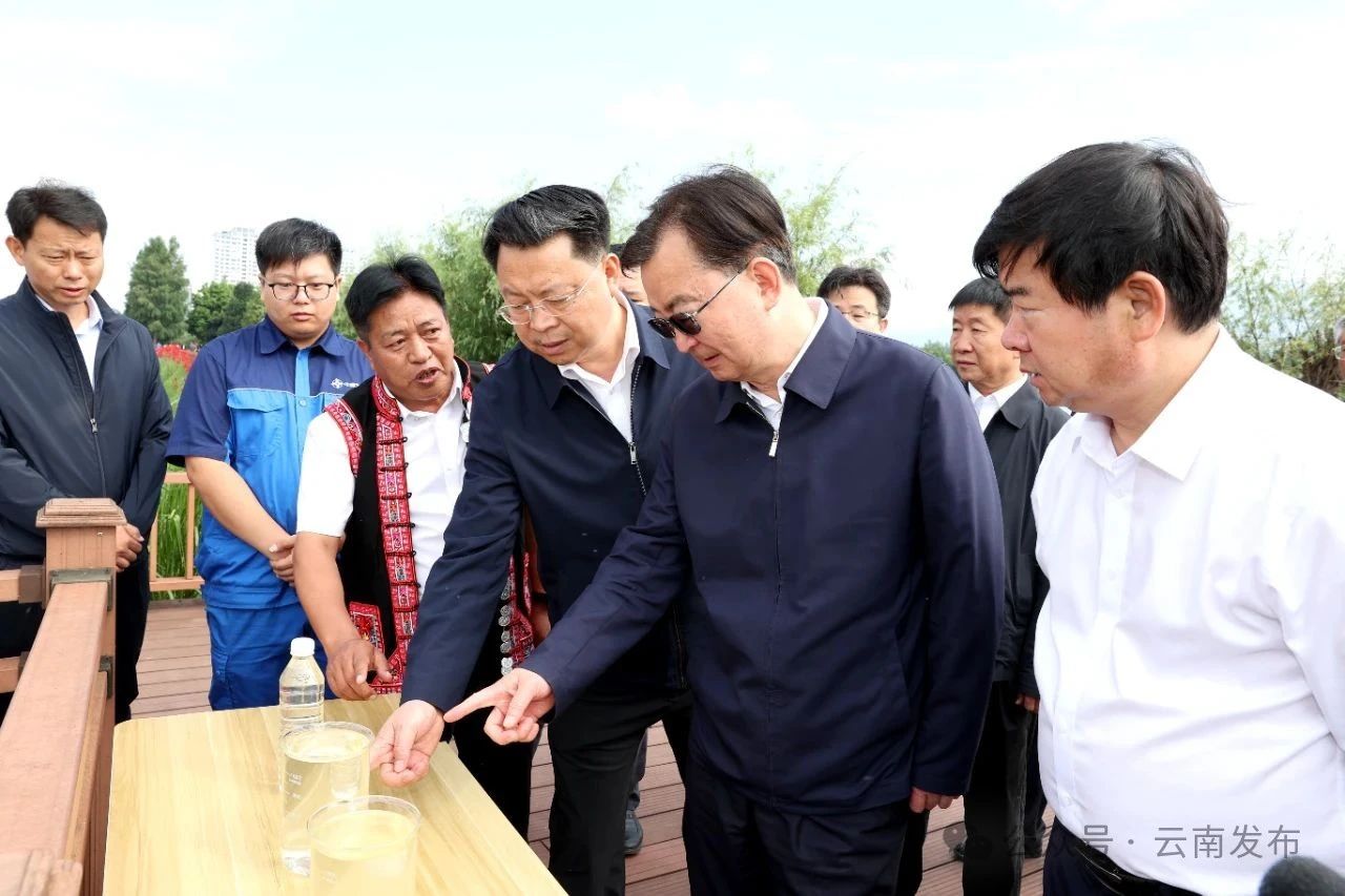 王寧在異龍湖邊察看水體,仔細了解在淺水湖區(qū)探索開展內(nèi)源污染治理取得的成效。