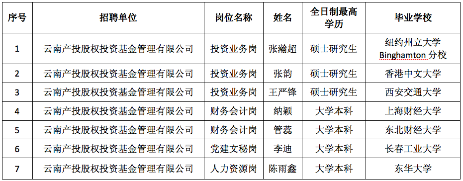 云南產(chǎn)投股權(quán)投資基金管理有限公司2021年社會(huì)招聘擬錄用人選公示
