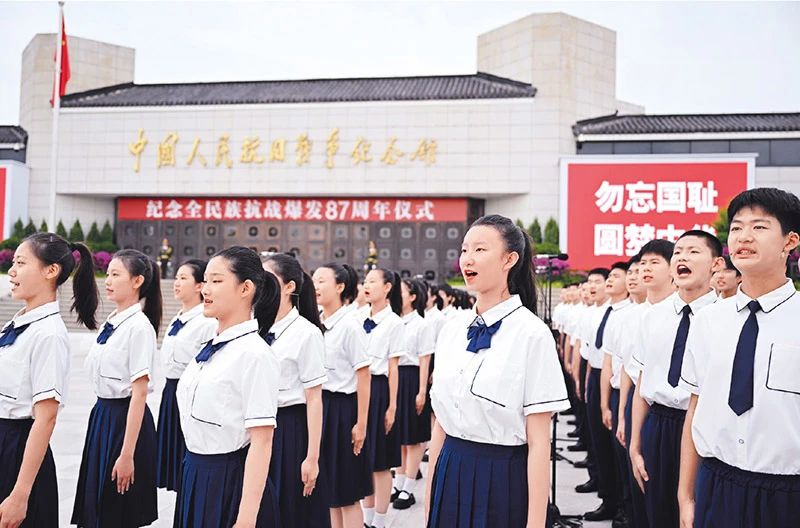 1937年7月7日,日本侵略軍悍然發(fā)動盧溝橋事變(七七事變),當(dāng)?shù)刂袊v軍奮起抵抗,全民族抗戰(zhàn)由此爆發(fā)。圖為2024年7月7日,首都學(xué)生代表參加在北京中國人民抗日戰(zhàn)爭紀念館舉行的紀念全民族抗戰(zhàn)爆發(fā)87周年儀式。 新華社記者 李響/攝