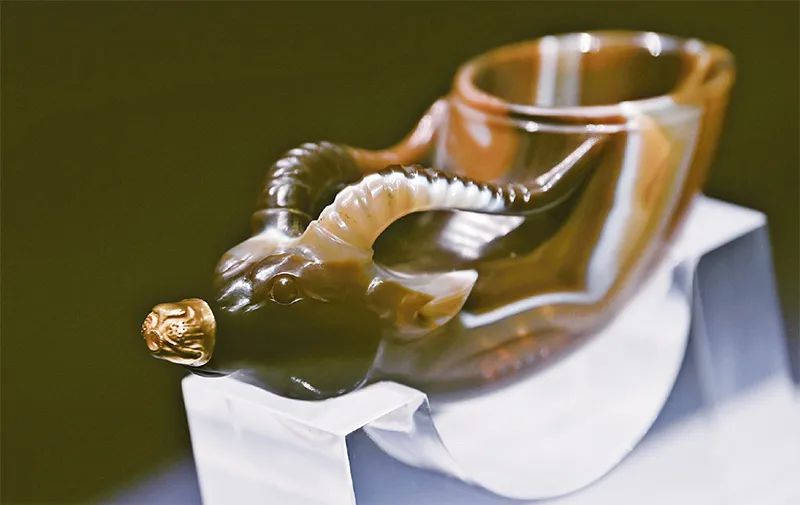 鑲金獸首瑪瑙杯的造型,與起源于古希臘的酒具“來(lái)通”相似,“來(lái)通”曾廣泛流行于中亞、西亞地區(qū),沿著絲綢之路不斷東傳進(jìn)入中國(guó),讓我們見(jiàn)證兩千余年來(lái)中華文明與絲綢之路沿線各國(guó)經(jīng)濟(jì)、文化交流的悠久歷史。圖為在陜西歷史博物館展出的鑲金獸首瑪瑙杯。新華社記者 李一博/攝