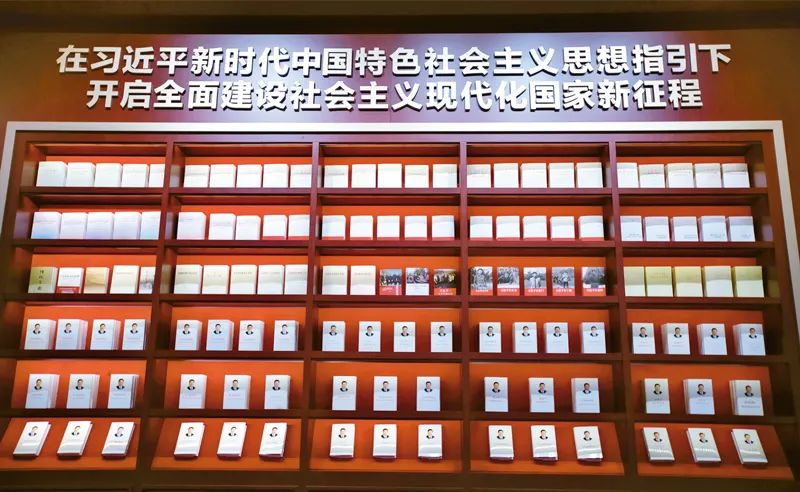 圖為中國共產(chǎn)黨歷史展覽館展出的習(xí)近平總書記的部分重要著作以及學(xué)習(xí)闡釋習(xí)近平新時(shí)代中國特色社會主義思想的部分重點(diǎn)圖書。劉新武/攝