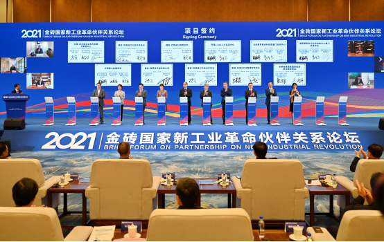 黨的十八大以來,習(xí)近平總書記引領(lǐng)金磚合作開啟構(gòu)建高質(zhì)量伙伴關(guān)系新征程。圖為2021年9月7日,在福建廈門舉行的2021金磚國家新工業(yè)革命伙伴關(guān)系論壇期間,金磚國家新工業(yè)革命伙伴關(guān)系創(chuàng)新基地舉行簽約儀式。新華社記者 林善傳/攝