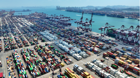 青島海關(guān)數(shù)據(jù)顯示,今年1月至5月,青島直達金磚國家的航線共完成箱量83萬標箱,同比增長12%,其中出口量增長26.1%。圖為繁忙的山東港口青島港前灣港區(qū),集裝箱貨輪在裝卸集裝箱(6月15日攝,無人機照片)。新華社記者 李紫恒 /攝