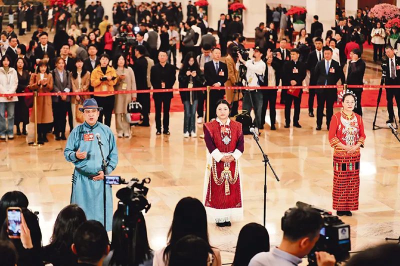 2025年3月10日,全國政協(xié)十四屆三次會(huì)議第三場(chǎng)“委員通道”在人民大會(huì)堂舉行。圖為少數(shù)民族委員亮相“委員通道”。?民族畫報(bào)記者 康夢(mèng)婷/攝