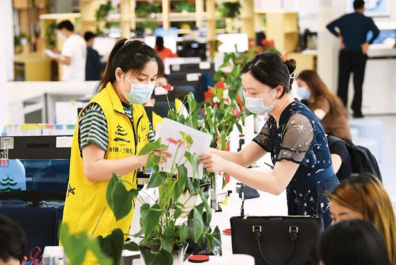 ?營商環(huán)境是企業(yè)生存發(fā)展的土壤。圖為2022年6月15日,貴州省貴陽市南明區(qū)政務(wù)服務(wù)大廳法人服務(wù)區(qū)的工作人員在給企業(yè)人員講解減稅降費優(yōu)惠政策。 ? ?求是圖片 趙松/攝