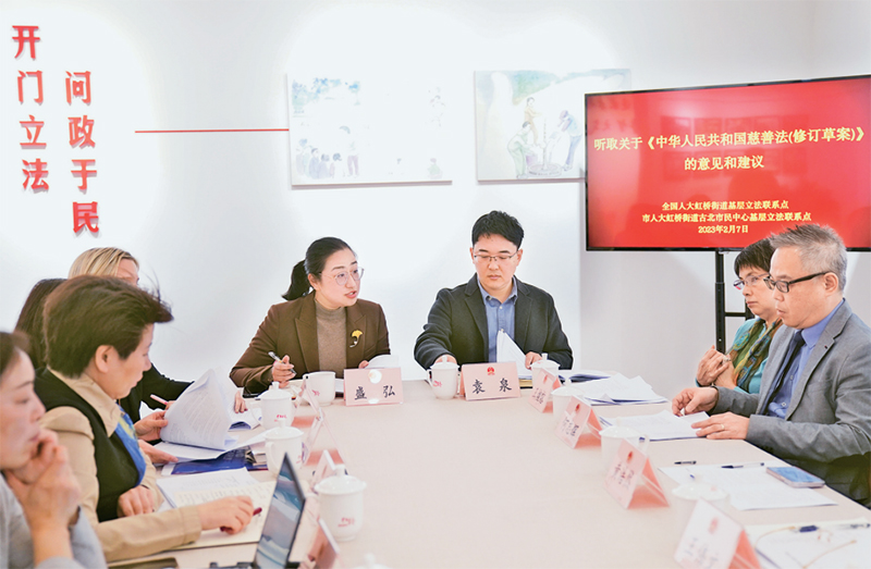 ?圖為2023年2月7日,在上海市長寧區(qū)虹橋街道基層立法聯(lián)系點召開的征詢會上,工作人員聽取相關(guān)人士對《中華人民共和國慈善法(修訂草案)》的意見和建議。新華社記者 劉穎/攝