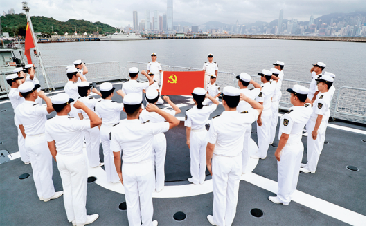黨對(duì)軍隊(duì)的絕對(duì)領(lǐng)導(dǎo)是人民軍隊(duì)的建軍之本、強(qiáng)軍之魂。圖為2021年6月29日,駐香港部隊(duì)某艦艇大隊(duì)組織官兵向黨旗宣誓。新華社發(fā) 陳杰/攝