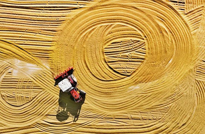 ?江蘇堅(jiān)持把農(nóng)業(yè)農(nóng)村發(fā)展擺在優(yōu)先位置,全方位夯實(shí)糧食安全根基。圖為2022年10月24日,工人在連云港市的云臺(tái)農(nóng)場(chǎng)用機(jī)械翻轉(zhuǎn)稻谷進(jìn)行晾曬。 視覺(jué)江蘇網(wǎng)供圖 王健民 殷尚/攝