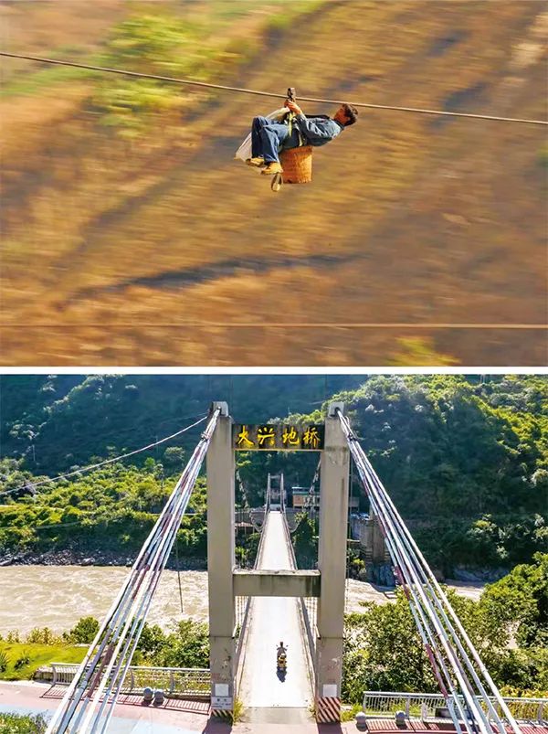 ?“過(guò)江靠溜索”曾是怒江兩岸群眾出行的重要方式。2013年,國(guó)家實(shí)施“溜索改橋”項(xiàng)目,幫助西部邊遠(yuǎn)山區(qū)群眾結(jié)束溜索時(shí)代,怒江州怒江段上溜索被改造為各式跨江橋梁,完成了沿江人民“天塹變通途”的企盼。上圖為2013年2月2日,在云南省怒江州瀘水市六庫(kù)街道,一名居民背著背簍溜索過(guò)江(新華社記者 王長(zhǎng)山/攝)。下圖為2022年9月13日,瀘水市居民騎摩托車通過(guò)大興地橋(無(wú)人機(jī)照片,新華社記者 江文耀/攝)。