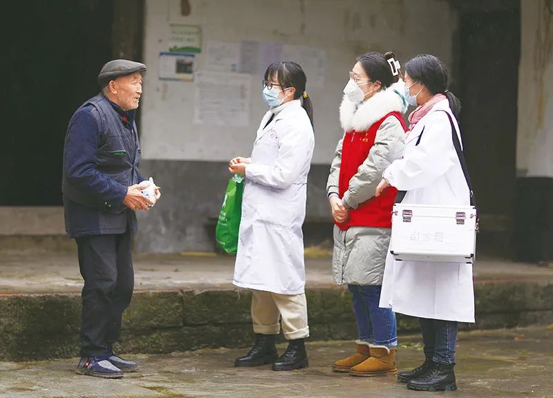 2022年12月28日,在貴州赤水市石堡鄉(xiāng)興農(nóng)村,醫(yī)護(hù)人員和黨員志愿者為村民提供送藥上門服務(wù),在新冠疫情防控進(jìn)入轉(zhuǎn)段階段后,積極發(fā)揮好基層醫(yī)療第一道防線作用。 新華社發(fā) 王長育/攝