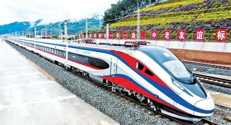 2021年12月3日,中老兩國(guó)互利合作的旗艦項(xiàng)目和高質(zhì)量共建“一帶一路”的標(biāo)志性工程——中老鐵路全線通車(chē)。圖為“瀾滄號(hào)”動(dòng)車(chē)組列車(chē)正在駛過(guò)中老鐵路磨憨站。 云南日?qǐng)?bào)供圖 陳暢/攝
