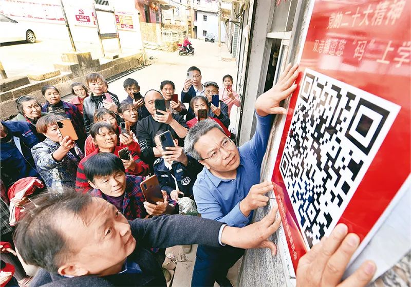 ?圖為2022年11月13日,江西省鄱陽縣雙港鎮(zhèn)黨員干部將宣講黨的二十大精神的二維碼貼在村頭,吸引不少村民前來掃碼學習了解有關知識。 中新社發(fā) 卓忠偉/攝