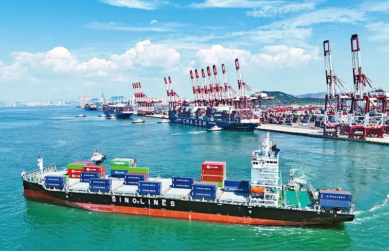 以開放促改革、促發(fā)展是我國現(xiàn)代化建設(shè)不斷取得新成就的重要法寶。圖為2023年8月30日,“中外運(yùn)??凇陛喚従忨傠x青島港,駛向印度欽奈港。2023年以來,青島港“一帶一路”國家和地區(qū)箱量保持兩位數(shù)增長。 新華社發(fā) 張進(jìn)剛/攝