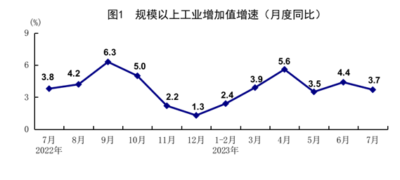 7月份,全國規(guī)模以上工業(yè)增加值同比增長3.7%,環(huán)比增長0.01%。分三大門類看,采礦業(yè)增加值同比增長1.3%,制造業(yè)增長3.9%,電力、熱力、燃氣及水生產(chǎn)和供應業(yè)增長4.1%。原材料制造業(yè)增加值同比增長8.8%,比上月加快2.0個百分點。分經(jīng)濟類型看,國有控股企業(yè)增加值同比增長3.4%;股份制企業(yè)增長5.0%,外商及港澳臺商投資企業(yè)下降1.8%;私營企業(yè)增長2.5%。分產(chǎn)品看,太陽能電池、新能源汽車產(chǎn)品產(chǎn)量同比分別增長65.1%、24.9%。1-7月份,全國規(guī)模以上工業(yè)增加值同比增長3.8%。7月份,制造業(yè)采購經(jīng)理指數(shù)為49.3%,企業(yè)生產(chǎn)經(jīng)營活動預期指數(shù)為55.1%。