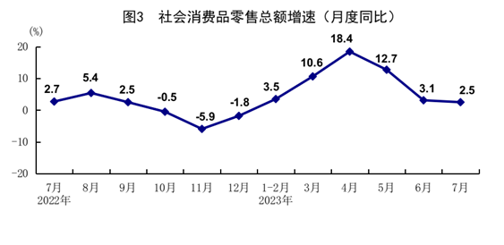 7月份,社會消費品零售總額36761億元,同比增長2.5%,環(huán)比下降0.06%。按經(jīng)營單位所在地分,城鎮(zhèn)消費品零售額31920億元,同比增長2.3%;鄉(xiāng)村消費品零售額4841億元,增長3.8%。按消費類型分,商品零售32483億元,增長1.0%;餐飲收入4277億元,增長15.8%。在限額以上單位商品零售額中,糧油、食品類,中西藥品類,飲料類,通訊器材類商品零售額分別增長5.5%、3.7%、3.1%、3.0%。1-7月份,社會消費品零售總額264348億元,同比增長7.3%。全國網(wǎng)上零售額83097億元,同比增長12.5%。其中,實物商品網(wǎng)上零售額69856億元,增長10.0%,占社會消費品零售總額的比重為26.4%。1-7月份,服務(wù)零售額同比增長20.3%。