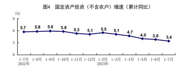 1-7月份,全國固定資產(chǎn)投資(不含農(nóng)戶)285898億元,同比增長3.4%。分領(lǐng)域看,基礎(chǔ)設(shè)施投資同比增長6.8%,制造業(yè)投資增長5.7%,房地產(chǎn)開發(fā)投資下降8.5%。全國商品房銷售面積66563萬平方米,同比下降6.5%;商品房銷售額70450億元,下降1.5%。分產(chǎn)業(yè)看,第一產(chǎn)業(yè)投資同比下降0.9%,第二產(chǎn)業(yè)投資增長8.5%,第三產(chǎn)業(yè)投資增長1.2%。民間投資下降0.5%。高技術(shù)產(chǎn)業(yè)投資同比增長11.5%,其中高技術(shù)制造業(yè)和高技術(shù)服務(wù)業(yè)投資分別增長11.5%、11.6%。高技術(shù)制造業(yè)中,醫(yī)療儀器設(shè)備及儀器儀表制造業(yè)、電子及通信設(shè)備制造業(yè)投資分別增長16.0%、13.9%;高技術(shù)服務(wù)業(yè)中,科技成果轉(zhuǎn)化服務(wù)業(yè)、專業(yè)技術(shù)服務(wù)業(yè)投資分別增長44.9%、23.8%。7月份,固定資產(chǎn)投資(不含農(nóng)戶)環(huán)比下降0.02%。