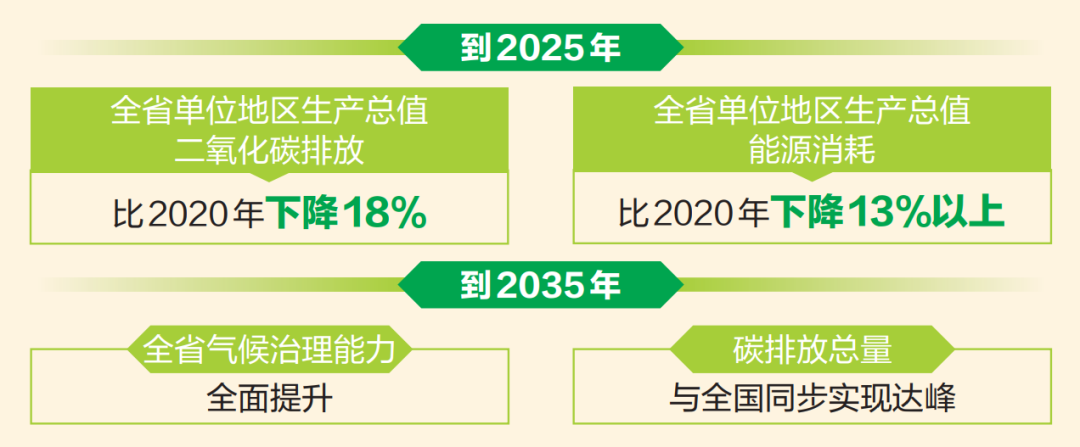 ?根據(jù)《規(guī)劃》,到2025年,全省單位地區(qū)生產(chǎn)總值二氧化碳排放比2020年下降18%,全省單位地區(qū)生產(chǎn)總值能源消耗比2020年下降13%以上。產(chǎn)業(yè)結(jié)構(gòu)和能源結(jié)構(gòu)進(jìn)一步優(yōu)化、適應(yīng)氣候變化能力不斷提升、試點(diǎn)示范取得顯著進(jìn)展、氣候治理能力取得重要成果?!兑?guī)劃》展望了2035年遠(yuǎn)景目標(biāo)。2035年全省氣候治理能力全面提升,碳排放總量已與全國(guó)同步實(shí)現(xiàn)達(dá)峰,經(jīng)濟(jì)社會(huì)已穩(wěn)步進(jìn)入高質(zhì)量發(fā)展階段,中國(guó)最美麗省份全面建成。