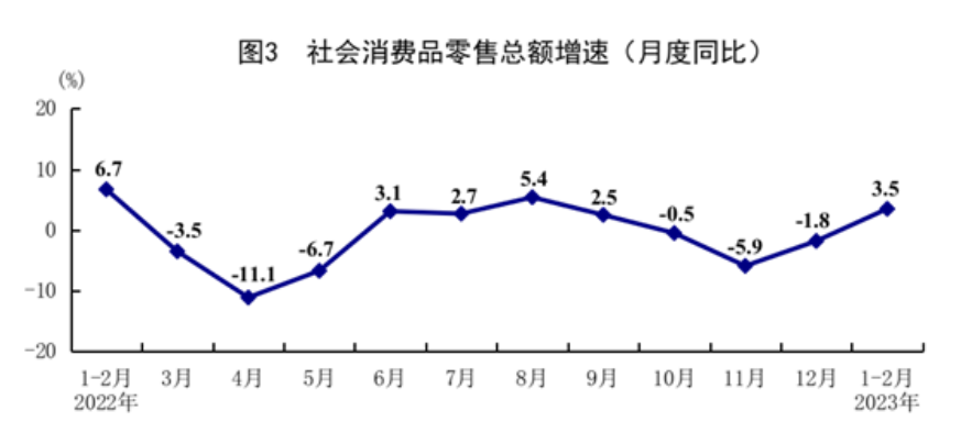 ?1-2月份,社會(huì)消費(fèi)品零售總額77067億元,同比增長(zhǎng)3.5%,2022年12月份為下降1.8%;兩年平均增長(zhǎng)5.1%。按經(jīng)營(yíng)單位所在地分,城鎮(zhèn)消費(fèi)品零售額66796億元,同比增長(zhǎng)3.4%;鄉(xiāng)村消費(fèi)品零售額10271億元,增長(zhǎng)4.5%。按消費(fèi)類型分,商品零售68638億元,增長(zhǎng)2.9%;餐飲收入8429億元,增長(zhǎng)9.2%?;旧铑惿唐蜂N售較快增長(zhǎng),限額以上單位糧油食品類、服裝鞋帽針紡織品類商品零售額分別增長(zhǎng)9.0%、5.4%;部分升級(jí)類商品銷售加快,限額以上單位金銀珠寶類、化妝品類商品零售額分別增長(zhǎng)5.9%、3.8%。全國(guó)網(wǎng)上零售額20544億元,增長(zhǎng)6.2%。其中,實(shí)物商品網(wǎng)上零售額17476億元,增長(zhǎng)5.3%,占社會(huì)消費(fèi)品零售總額的比重為22.7%。從環(huán)比看,2月份社會(huì)消費(fèi)品零售總額比上月下降0.02%。