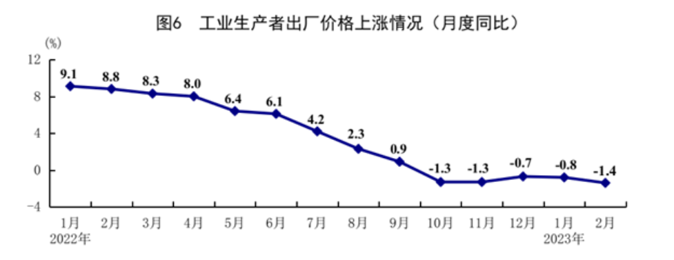 ?1-2月份,全國(guó)工業(yè)生產(chǎn)者出廠價(jià)格同比下降1.1%。分月看,1月份同比下降0.8%,環(huán)比下降0.4%;2月份同比下降1.4%,環(huán)比持平。1-2月份,工業(yè)生產(chǎn)者購(gòu)進(jìn)價(jià)格同比下降0.2%。