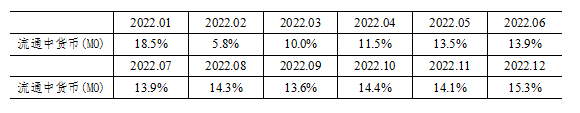 注4:自2022年12月起,“流通中貨幣(M0)”含流通中數字人民幣。12月末流通中數字人民幣余額為136.1億元。修訂后,2022年各月末M1、M2增速無明顯變化。修訂后M0增速如下:
