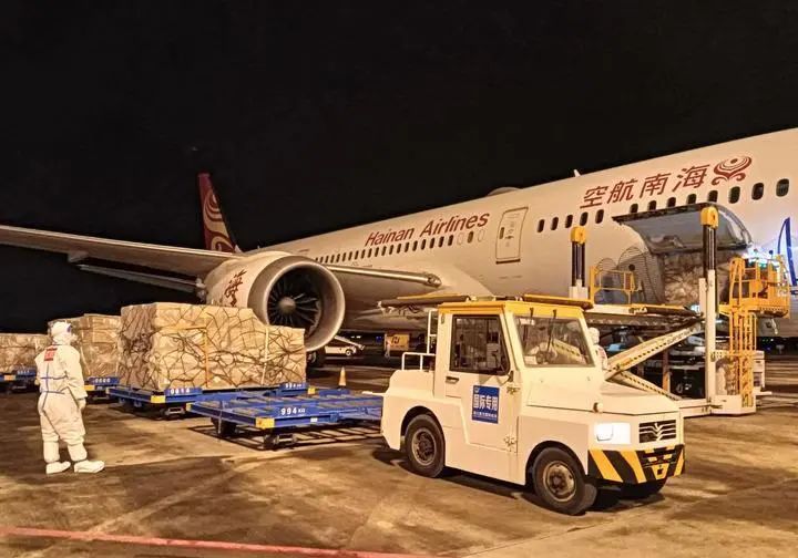 ?11月24日,??诿捞m國際機場的工作人員在停機坪裝運貨物。次日凌晨,??凇ㄌm克福客改貨定期洲際航線正式恢復(fù)。新華社發(fā)