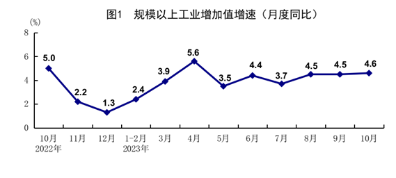10月份,全國規(guī)模以上工業(yè)增加值同比增長4.6%,比上月加快0.1個百分點;環(huán)比增長0.39%。分三大門類看,采礦業(yè)增加值同比增長2.9%,制造業(yè)增長5.1%,電力、熱力、燃氣及水生產(chǎn)和供應業(yè)增長1.5%。裝備制造業(yè)增加值同比增長6.2%,比上月加快0.7個百分點,連續(xù)3個月回升。分經(jīng)濟類型看,國有控股企業(yè)增加值同比增長4.9%;股份制企業(yè)增長5.6%,外商及港澳臺商投資企業(yè)增長0.9%;私營企業(yè)增長3.9%。分產(chǎn)品看,太陽能電池、服務機器人、集成電路產(chǎn)品產(chǎn)量同比分別增長62.8%、59.1%、34.5%。1-10月份,全國規(guī)模以上工業(yè)增加值同比增長4.1%。1-9月份,全國規(guī)模以上工業(yè)企業(yè)實現(xiàn)利潤總額同比下降9.0%,降幅比1-8月份收窄2.7個百分點,其中9月份同比增長11.9%。10月份,制造業(yè)采購經(jīng)理指數(shù)為49.5%,企業(yè)生產(chǎn)經(jīng)營活動預期指數(shù)為55.6%。