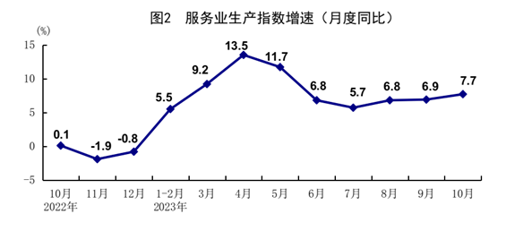 10月份,全國服務業(yè)生產(chǎn)指數(shù)同比增長7.7%,比上月加快0.8個百分點。分行業(yè)看,住宿和餐飲業(yè),交通運輸、倉儲和郵政業(yè),信息傳輸、軟件和信息技術服務業(yè),批發(fā)和零售業(yè),金融業(yè)生產(chǎn)指數(shù)同比分別增長21.3%、13.2%、10.9%、10.0%、7.8%。1-10月份,全國服務業(yè)生產(chǎn)指數(shù)同比增長7.9%。1-9月份,規(guī)模以上服務業(yè)企業(yè)營業(yè)收入同比增長7.1%。10月份,服務業(yè)商務活動指數(shù)為50.1%,業(yè)務活動預期指數(shù)為57.5%,其中,鐵路運輸、航空運輸、郵政、電信廣播電視及衛(wèi)星傳輸服務等行業(yè)商務活動指數(shù)位于60.0%以上高位景氣區(qū)間。