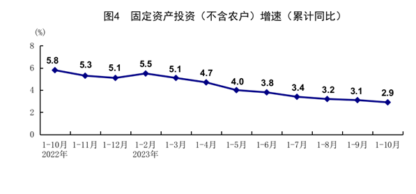 1-10月份,全國固定資產(chǎn)投資(不含農(nóng)戶)419409億元,同比增長2.9%,比1-9月份回落0.2個百分點。分領域看,基礎設施投資同比增長5.9%,制造業(yè)投資增長6.2%,房地產(chǎn)開發(fā)投資下降9.3%。全國商品房銷售面積92579萬平方米,同比下降7.8%;商品房銷售額97161億元,下降4.9%。分產(chǎn)業(yè)看,第一產(chǎn)業(yè)投資同比下降1.3%,第二產(chǎn)業(yè)投資增長9.0%,第三產(chǎn)業(yè)投資增長0.4%。民間投資下降0.5%,降幅比1-9月份收窄0.1個百分點;扣除房地產(chǎn)開發(fā)投資,民間投資同比增長9.1%。高技術產(chǎn)業(yè)投資同比增長11.1%,其中高技術制造業(yè)和高技術服務業(yè)投資分別增長11.3%、10.5%。高技術制造業(yè)中,航空、航天器及設備制造業(yè),醫(yī)療儀器設備及儀器儀表制造業(yè)投資分別增長19.0%、16.7%;高技術服務業(yè)中,科技成果轉化服務業(yè)、專業(yè)技術服務業(yè)投資分別增長37.3%、29.1%。10月份,固定資產(chǎn)投資(不含農(nóng)戶)環(huán)比增長0.10%。