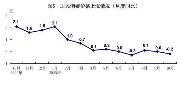 10月份,全國居民消費價格(CPI)同比下降0.2%,環(huán)比下降0.1%。分類別看,食品煙酒價格同比下降2.1%,衣著價格上漲1.1%,居住價格上漲0.3%,生活用品及服務價格下降0.6%,交通通信價格下降0.9%,教育文化娛樂價格上漲2.3%,醫(yī)療保健價格上漲1.3%,其他用品及服務價格上漲3.6%。在食品煙酒價格中,豬肉價格下降30.1%,鮮菜價格下降3.8%,糧食價格上漲0.6%,鮮果價格上漲2.2%??鄢称泛湍茉磧r格后的核心CPI同比上漲0.6%。1-10月份,全國居民消費價格同比上漲0.4%。