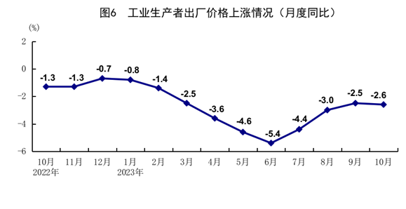 10月份,全國工業(yè)生產(chǎn)者出廠價格同比下降2.6%,環(huán)比持平。全國工業(yè)生產(chǎn)者購進價格同比下降3.7%,環(huán)比上漲0.2%。1-10月份,全國工業(yè)生產(chǎn)者出廠價格和購進價格同比分別下降3.1%和3.6%。