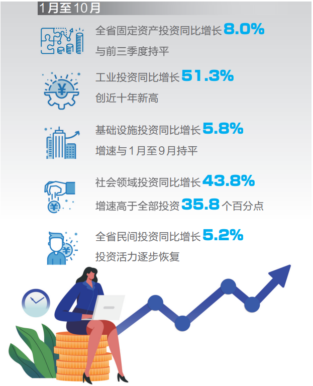 ?今年以來,全省大抓產(chǎn)業(yè)、主攻工業(yè)、抓牢項目,克服房地產(chǎn)開發(fā)、交通投資等持續(xù)下滑等不利影響,投資規(guī)模不斷擴大,投資結(jié)構(gòu)持續(xù)優(yōu)化,全省固定資產(chǎn)投資保持平穩(wěn)增長。1月至10月,全省固定資產(chǎn)投資同比增長8.0%,與前三季度持平。