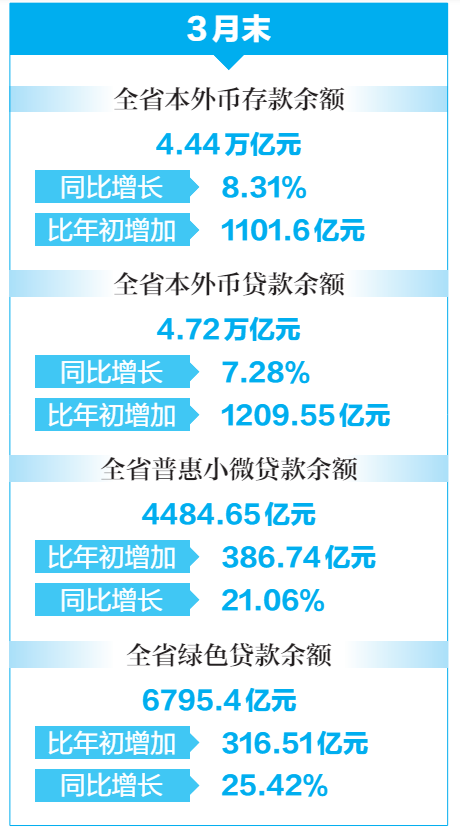 數(shù)據(jù)顯示,3月末,全省普惠小微貸款余額4484.65億元,比年初增加386.74億元,同比增長(zhǎng)21.06%;全省綠色貸款余額6795.4億元,比年初增加316.51億元,同比增長(zhǎng)25.42%。