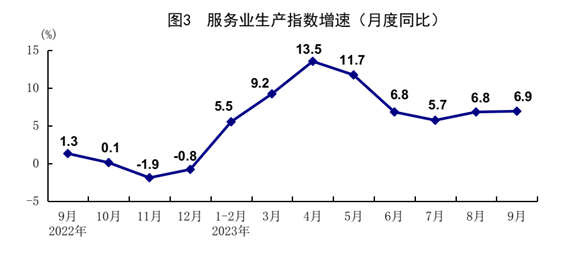 前三季度,服務業(yè)增加值同比增長6.0%。其中,住宿和餐飲業(yè),信息傳輸、軟件和信息技術服務業(yè),租賃和商務服務業(yè),交通運輸、倉儲和郵政業(yè),金融業(yè)增加值分別增長14.4%、12.1%、9.5%、7.5%、7.0%。9月份,服務業(yè)生產指數同比增長6.9%,比上月加快0.1個百分點,增速連續(xù)2個月回升。其中,住宿和餐飲業(yè),信息傳輸、軟件和信息技術服務業(yè),交通運輸、倉儲和郵政業(yè)生產指數分別增長17.7%、11.3%、9.3%。1-8月份,全國規(guī)模以上服務業(yè)企業(yè)營業(yè)收入同比增長7.2%。9月份,服務業(yè)商務活動指數為50.9%,比上月上升0.4個百分點;業(yè)務活動預期指數為58.1%。其中,水上運輸、郵政、電信廣播電視及衛(wèi)星傳輸服務、互聯網軟件及信息技術服務、貨幣金融服務等行業(yè)商務活動指數位于55.0%以上較高景氣區(qū)間。