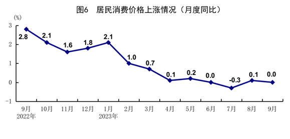 前三季度,全國居民消費價格(CPI)同比上漲0.4%。分類別看,食品煙酒價格上漲1.1%,衣著價格上漲0.9%,居住價格下降0.1%,生活用品及服務價格上漲0.2%,交通通信價格下降2.4%,教育文化娛樂價格上漲1.9%,醫(yī)療保健價格上漲1.1%,其他用品及服務價格上漲3.2%。在食品煙酒價格中,豬肉價格下降6.8%,鮮菜價格下降3.1%,糧食價格上漲1.2%,鮮果價格上漲6.0%??鄢称泛湍茉磧r格后的核心CPI同比上漲0.7%。9月份,全國居民消費價格同比持平,環(huán)比上漲0.2%。