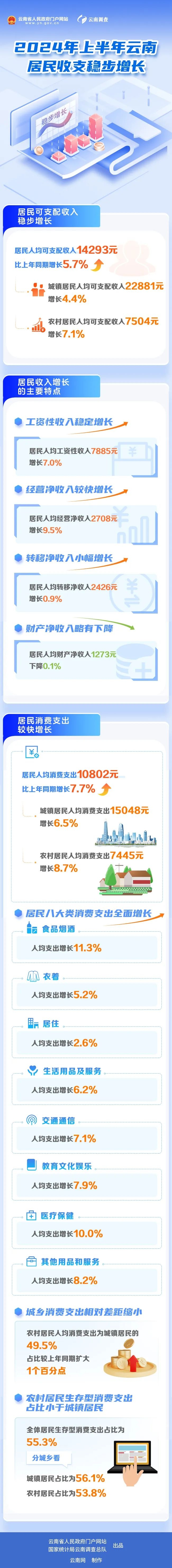 國家統(tǒng)計局云南調(diào)查總隊調(diào)查數(shù)據(jù)顯示,上半年云南居民人均可支配收入14293元,比上年同期增長5.7%,扣除價格因素實際增長5.6%。城鎮(zhèn)居民人均可支配收入22881元,增長4.4%,扣除價格因素實際增長4.4%。農(nóng)村居民人均可支配收入7504元,增長7.1%,扣除價格因素實際增長7.0%。