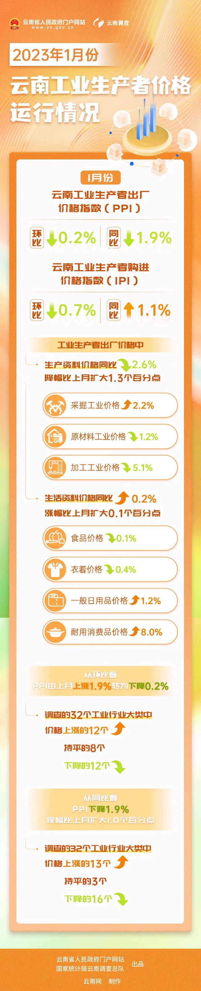 國(guó)家統(tǒng)計(jì)局云南調(diào)查總隊(duì)根據(jù)國(guó)家現(xiàn)行統(tǒng)計(jì)調(diào)查制度規(guī)定依法開展的工業(yè)生產(chǎn)者價(jià)格調(diào)查結(jié)果顯示:2023年1月份,受國(guó)際原油價(jià)格波動(dòng)和國(guó)內(nèi)煤炭?jī)r(jià)格下行等因素影響,云南工業(yè)生產(chǎn)者出廠價(jià)格指數(shù)(PPI)環(huán)比下降0.2%,同比下降1.9%,降幅比上月擴(kuò)大1.0個(gè)百分點(diǎn);購(gòu)進(jìn)價(jià)格指數(shù)(IPI)環(huán)比下降0.7%,同比上漲1.1%,漲幅較上月回落0.9個(gè)百分點(diǎn)。