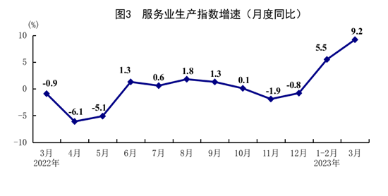 一季度,服務(wù)業(yè)增加值同比增長5.4%,比上年四季度加快3.1個百分點。其中,住宿和餐飲業(yè),信息傳輸、軟件和信息技術(shù)服務(wù)業(yè),金融業(yè),租賃和商務(wù)服務(wù)業(yè),批發(fā)和零售業(yè)增加值分別增長13.6%、11.2%、6.9%、6.0%、5.5%。3月份,全國服務(wù)業(yè)生產(chǎn)指數(shù)同比增長9.2%,比1-2月份加快3.7個百分點。其中,住宿和餐飲業(yè),信息傳輸、軟件和信息技術(shù)服務(wù)業(yè),交通運輸、倉儲和郵政業(yè)生產(chǎn)指數(shù)分別增長29.9%、12.0%、11.9%,比1-2月份分別加快18.3、2.7、7.7個百分點。1-2月份,規(guī)模以上服務(wù)業(yè)企業(yè)營業(yè)收入同比增長3.4%。3月份,服務(wù)業(yè)商務(wù)活動指數(shù)為56.9%,業(yè)務(wù)活動預(yù)期指數(shù)為63.2%。其中,零售、鐵路運輸、道路運輸、航空運輸、租賃及商務(wù)服務(wù)等行業(yè)商務(wù)活動指數(shù)高于60.0%。